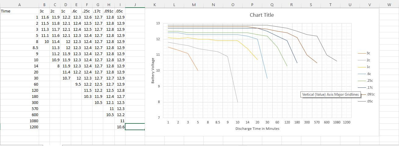 For most cases I haven’t plotted below 10 as 12 volt batteries are considered fully empty at 10.8 – 10.5. And discharging to full capacity reduces battery life a lot. As per datasheet 100% discharge every time will give a battery life of 200 – 300 cycles, where 50% discharge always will give a battery life of 600+ cycles. And a discharge beyond 10.5 will decrease life or capacity drastically.